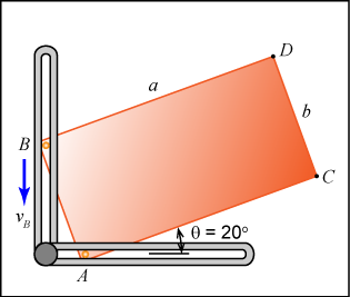 The rectangular plate is confined by rollers within slots at A and B. When θ = 20o, point B is moving at vB = 10 m/s. Determine the velocity of points C and D at this instant. The dimensions of the plate are a = 100 mm and b = 50 mm.