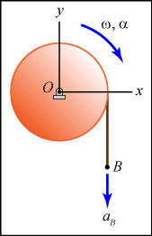 RP4-14) A cord is wrapped around a cylinder of radius 0.2 meters, as shown in the figure. Starting from rest, the cord is pulled downward with a constant acceleration of 10 m/s2. Determine the angular acceleration and angular velocity of the disk after it has completed 10 revolutions.