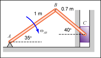 RP4-15) When the slider block C is in the position shown, the link AB has a clockwise angular velocity of 2 rad/s. Determine the velocity of block C at this instant. The length of link AB is 1 meter and the length of link BC is 0.7 meters.
