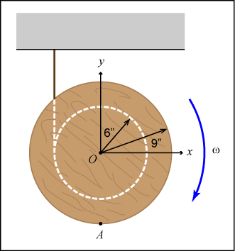 RP4-16) A cord is wrapped around the inner hub of a wooden spool. The end of the cord is attached to a fixed horizontal support. The spool is released and allowed to fall under the influence of gravity as the cord unwinds. Assuming that the spool does not sway back and forth, determine the velocity of point A for the instant shown where the speed of the center of the spool (point O) has reached 5 ft/s.