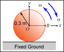 RP4-17) The ball shown rolls without slipping and has an angular velocity and angular acceleration of 6 rad/s and 4 rad/s2, respectively, with the directions shown in the figure. Determine the acceleration of point B at this instant.