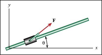 A bushing slides on a shaft that forms a 20o angle with respect to the x-axis. A constant force F = 5i + 4j N acts on the bushing. Determine the work the force performs on the bushing if it moves a total distance of 2 m along the shaft.